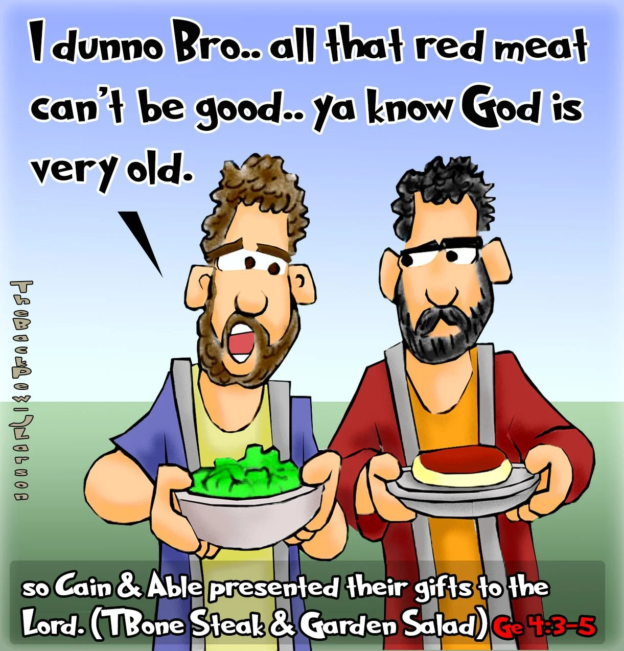 All is fine and good livin' La-vi-la-Genesis until Cain and Able were to bring their gifts to the Lord. God accepted Abel’s gift but rejected Cain’s. Of course, Cain went on to defend his salad-sacrifice by debating the health risks of too much red meat.