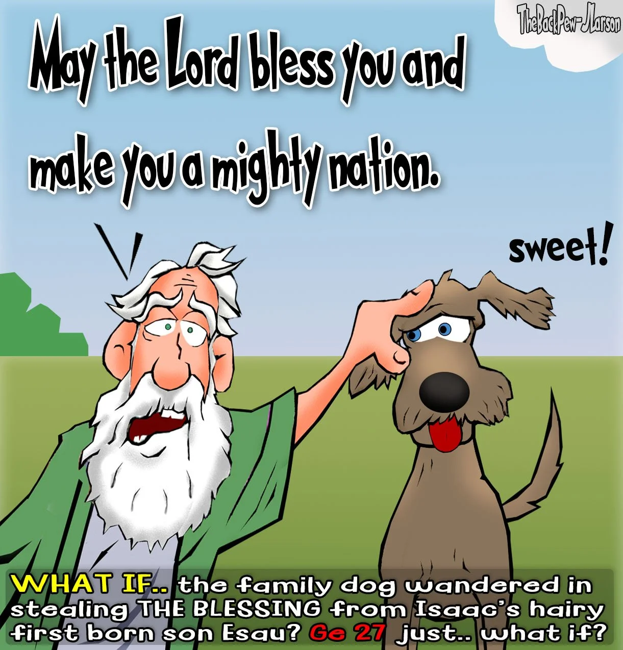 Of course, being a cartoonist and a dog owner, I ponder... WHAT IF the FAMILY DOG wanders onto the scene before the walking, talking/lying carpet remnant Jacob and receives the firstborn's blessing?